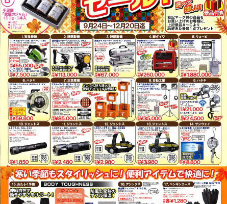 工具でお馴染みのニクナスのオータムセールが始まりました。今回もお得な商品が目白押しの内容となっています。数量限定品もございますので、お早めに担当者までお申し付けください。「景品付き」のマークが付いた商品は、ご購入頂きますとA~Cより、お好きな景品を1点プレゼントさせて頂きます。